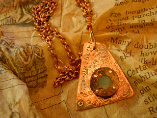 I also made the chain on this piece. It is made with two discs of hand hammered copper sewn together with wire holding the stone in the middle. As I post this pic my front yard rose garden is starting to reveal itself from the two foot blanket of snow that has been covering it. It is so fun to watch the green clumps of grape hyacinths and myrtle appear through the snow. Before I know it, my roses will be in full bloom. Yes, time does sneak past me that fast. Back to work - beating up some more metal!